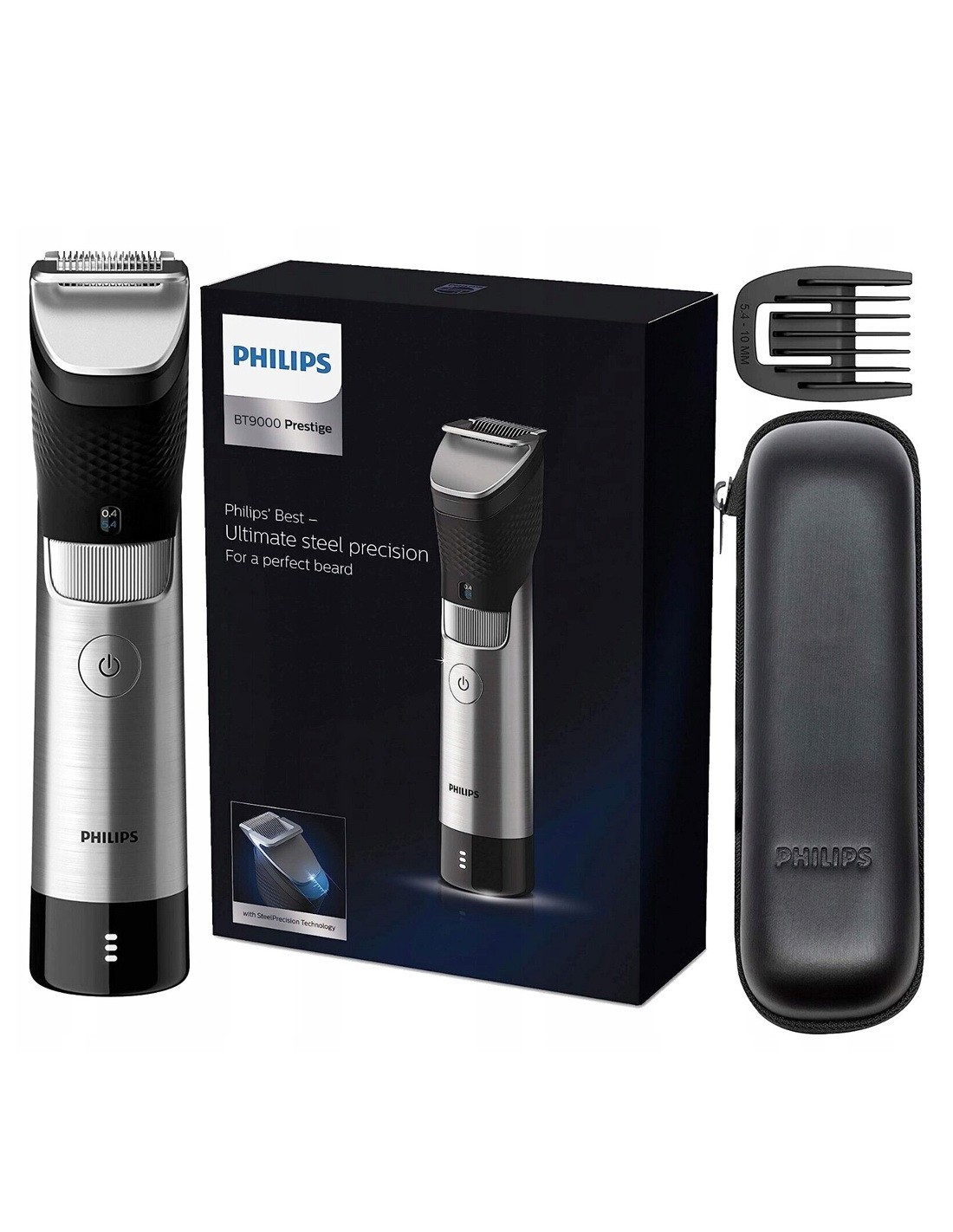 Beard trimmer 9000 Prestige High-precision steel components to create the perfect beard The Philips BT9000 Prestige trimmer delivers unmatched precision shaving thanks to a built-in metal comb that allows you to trim hairs precisely regardless of the pressure on the skin.